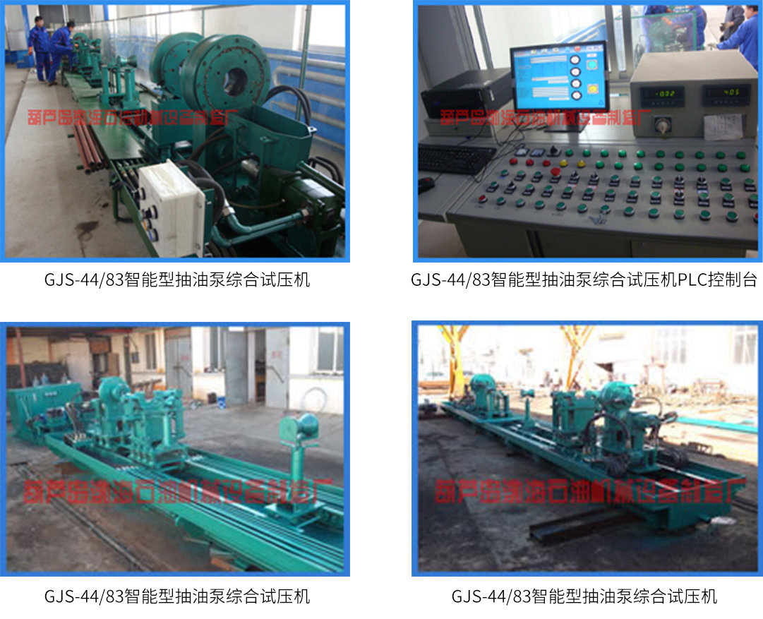 GJS-44/83智能型抽油泵綜合試壓機(jī)是我廠新研制的抽油泵試壓機(jī),主要用于舊抽油泵拆裝和新舊抽油泵檢測(壓力檢測和漏失量檢測)。試壓過程由PLC自動控制,漏失量自動計(jì)量。計(jì)算機(jī)顯示壓力、扭矩、漏失量數(shù)據(jù),且具有自動儲存、報表、打印等功能。
